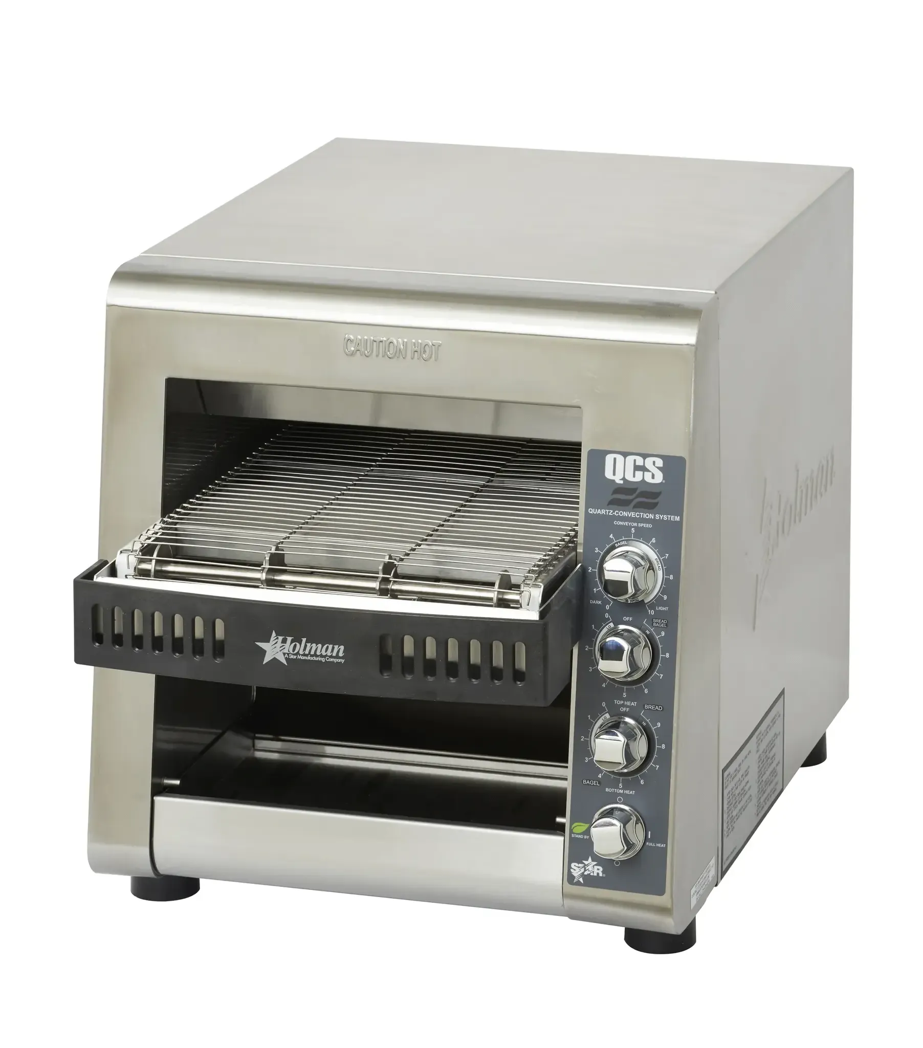 Star’s QCS3-1000 conveyor toaster can generate up to 1,000 slices per hour without taking up too much counter space. The QCS3-1000 features analog controls, a 1.5" product opening, 14" wide variable speed conveyor belt, and independent top and bottom heat controls. Star’s forced convection system keeps the toaster cool-to-the-touch and extends the life of critical components. Stainless steel construction is used for long lasting durability and the heavy-duty motor utilizes a drive chain for superior reliability.