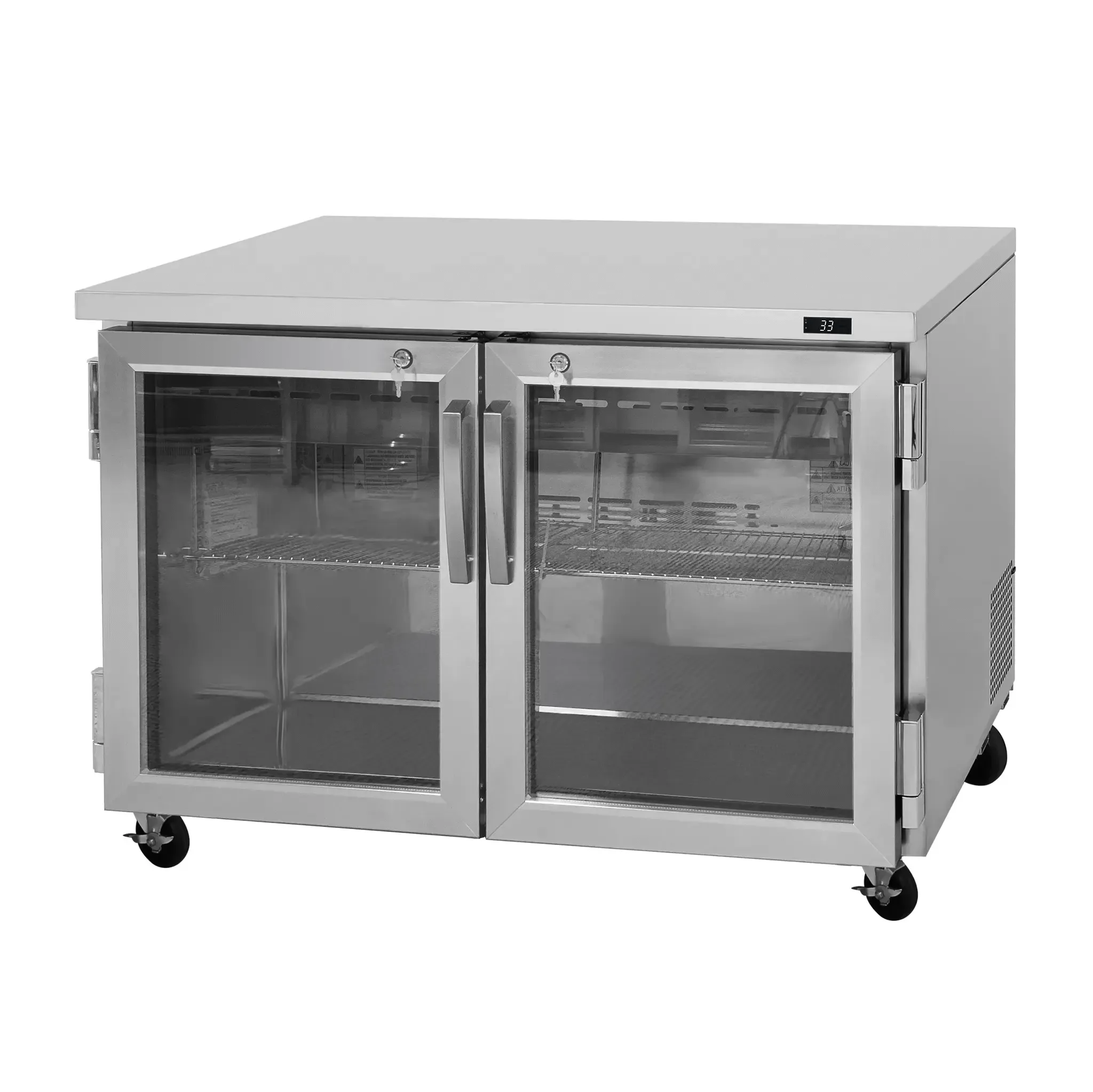 Invest in superior quality with the Turbo Air PUR-48-G-N Undercounter Refrigerator. This PRO Series refrigerator is designed specifically for commercial restaurant use, offering a spacious 12.2 cu. ft. capacity to meet all your storage needs. The two-section design features hinged swing glass doors with locks, allowing you to easily access and secure your ingredients. The aluminum door liner and stainless steel exterior and interior ensure durability and easy cleaning, while the LED interior lighting and fan control provide excellent visibility and temperature control. With a self-contained rear mount refrigeration system and a digital temperature control and monitor system, you can trust that your food will be kept at the perfect temperature. The self-cleaning condensate system and R290 Hydrocarbon refrigerant make maintenance a breeze. Made in the USA and certified by cETLus and ETL-Sanitation, the Turbo Air PUR-48-G-N is the ideal undercounter refrigerator for any commercial kitchen.