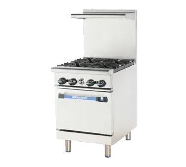 Unleash your kitchen's potential with the Turbo Air TAR-4 Range, a powerful and reliable addition to any commercial restaurant. This 24" gas range is designed to meet the demands of a busy kitchen, offering exceptional performance and durability. With four lift-off top open burners, each delivering 32,000 BTU/hr, you'll have the power and precision to cook multiple dishes simultaneously. The range also features a standard oven with a rack, allowing you to bake and roast with ease. The stainless steel construction of the front, sides, and back riser ensures long-lasting durability and easy cleaning. The full stainless steel oven interior is not only hygienic but also provides even heat distribution for consistent cooking results. With an adjustable oven thermostat and 6" stainless steel adjustable legs, this range offers flexibility and stability. CSA and CSA-Sanitation certified, the Turbo Air TAR-4 Range is a reliable and efficient choice for any commercial kitchen.