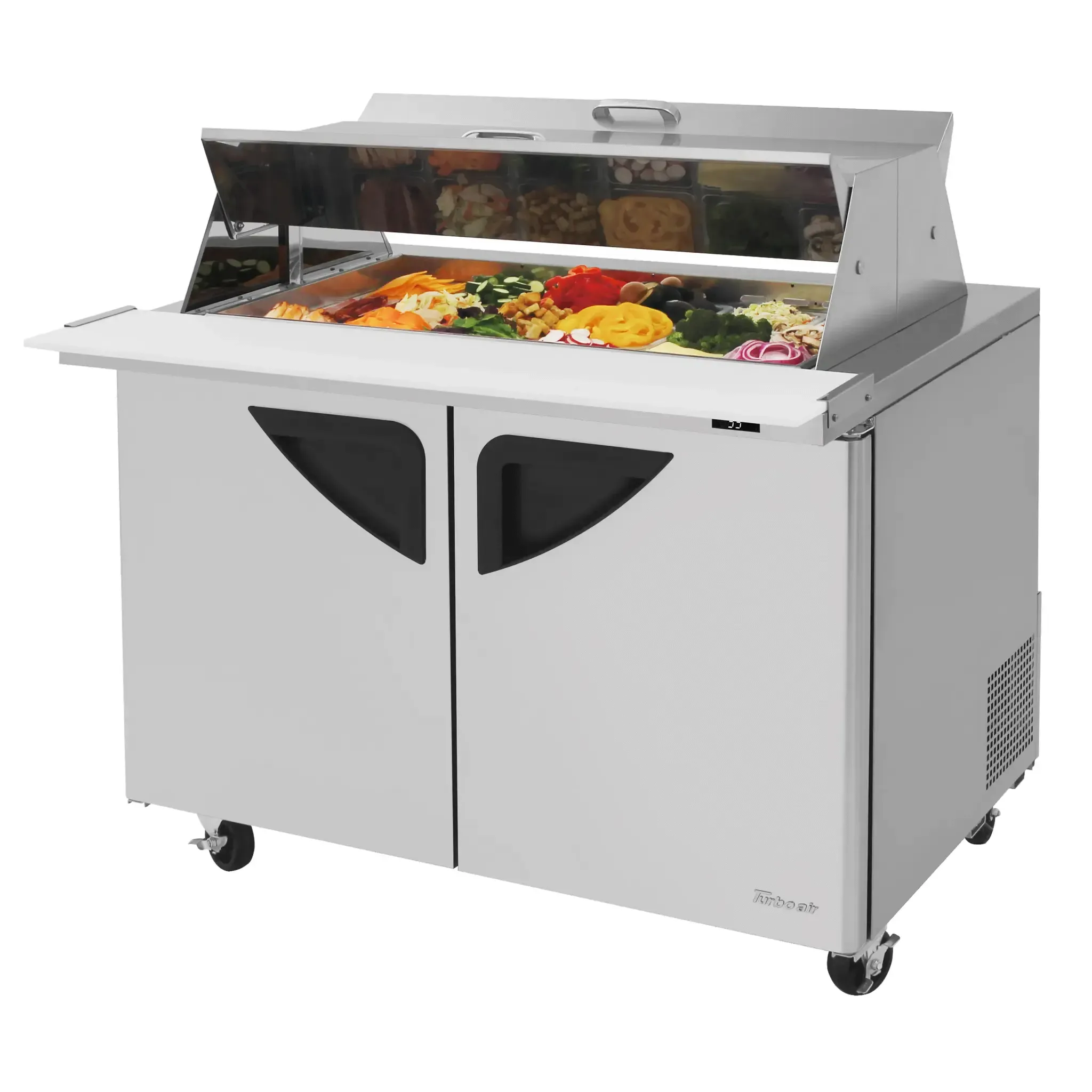 Upgrade your restaurant kitchen with the Turbo Air TST-48SD-18-N-DS Refrigerated Counter, Mega Top Sandwich/Salad Unit. This two-section unit is designed to meet the demands of a busy commercial restaurant. With a spacious 15.0 cu. ft. capacity and a stainless steel top with an 18-pan opening, you'll have plenty of room to store and organize your ingredients. The digital temperature control and monitoring system ensure that your food stays at the perfect temperature, while the self-cleaning condenser keeps the unit running efficiently. The stainless steel interior and exterior are not only durable but also easy to clean. The LED interior lighting provides excellent visibility, making it easy to find what you need. With its cutting board side rail and insulated pan cover, this unit is perfect for preparing sandwiches and salads. Upgrade your kitchen today with the Turbo Air TST-48SD-18-N-DS Refrigerated Counter, Mega Top Sandwich/Salad Unit.