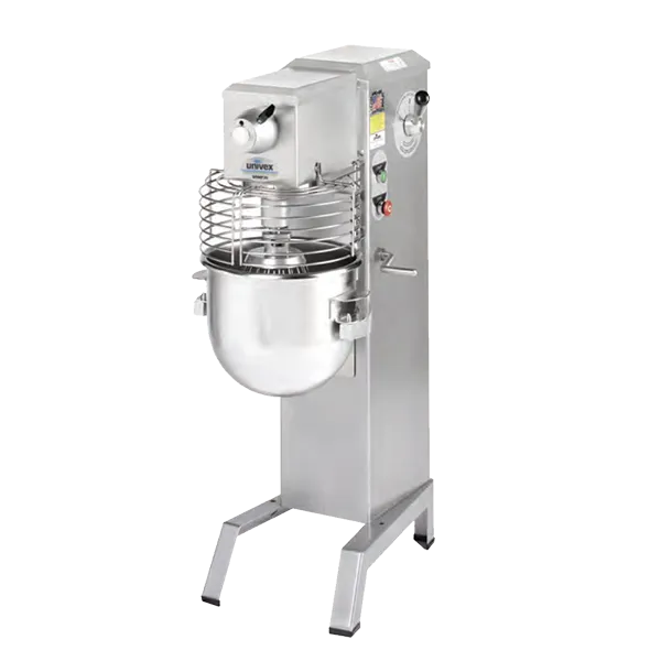 Culinary Perfection Made Simple with the Univex SRMF20+ W/O Mixer, Planetary. This floor model mixer is designed for commercial restaurant use, offering a generous 22 quart capacity to handle large batches of dough, batter, and more. With its variable speed drive and hand-operated hand crank, you have complete control over the mixing process. The self-locking top and bottom ensure stability and safety during operation. Included with the mixer are a stainless steel bowl, dough hook, batter beater, wire whip, and ingredient chute, providing versatility for various recipes. The bowl scraper helps to ensure every last bit of ingredients is incorporated, while the dishwasher-safe stainless steel safety guard makes cleaning a breeze. Made in the USA with alloy gears and a hybrid epoxy/polyester powder coat finish, this mixer is built to withstand the demands of a busy commercial kitchen. Trust in Univex for culinary excellence.