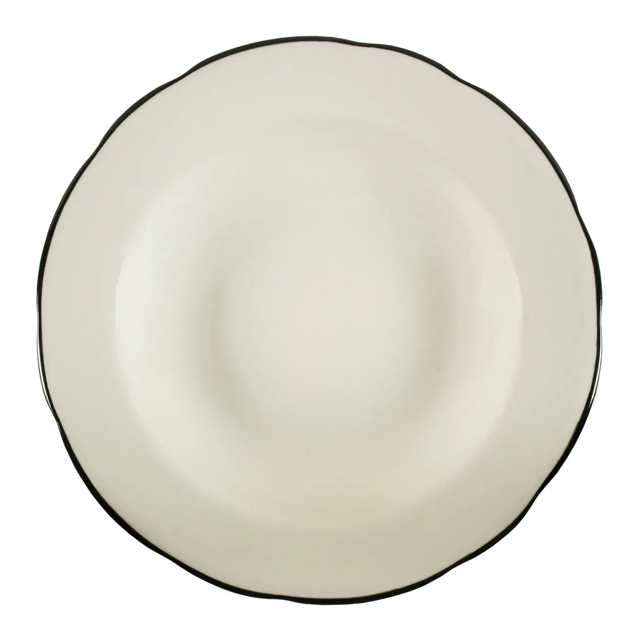 Upgrade your dining setting with the Vertex China CSCB-3 Soup Bowl. This 10 oz. bowl is perfect for serving soups, stews, and other delicious dishes in your commercial restaurant. Made from scratch-resistant vitrified china, this bowl is designed to withstand the rigors of a busy kitchen. Its 9" diameter and round shape with a rim provide ample space for generous portions, while the black line adds a touch of elegance to your table setting. The microwave and dishwasher-safe design ensures easy heating and cleaning, saving you time and effort. Elevate your dining experience with the California Scalloped Collection from Vertex China and impress your customers with the quality and style of this soup bowl.