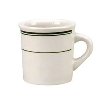 Elevate your table arrangements effortlessly with the Vertex China, DMG-38 Mug. This 8 oz. Arcadian Mug is the perfect addition to any commercial restaurant setting. Made with vitrified china, it is both microwave and dishwasher safe, ensuring convenience and durability. The Del Mar Green Collection adds a touch of elegance to your table, while the American White color complements any decor. Its 3-1/8" size, including the handle, provides a comfortable grip for your customers. Whether serving hot beverages or showcasing desserts, this mug is versatile and functional. Enhance your dining experience with this stylish and practical mug.
