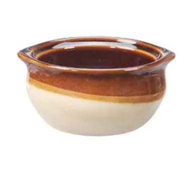 Transform your dining setting seamlessly with the Vertex China, OSC-10-CB Soup Bowl Crock. This onion soup crock is designed to elevate your restaurant's presentation and provide a durable solution for serving delicious soups. With a capacity of 10 oz., this round crock is perfect for individual servings. Made from scratch-resistant vitrified china, it can withstand the rigors of a busy commercial kitchen. The caramel/brown color adds a touch of elegance to your table, while the microwave and dishwasher-safe design ensures easy cleaning and reheating. The Vertex China Soup Bowl Crock is part of the Better Values Brown Accessories Collection, offering you a range of coordinating pieces to create a cohesive look. Upgrade your dining experience with this versatile and stylish crock.
