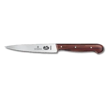 Equip Your Kitchen for Excellence with the Victorinox Swiss Army, 5.2030.12 Utility Knife. This high-quality knife is designed to meet the demands of a commercial restaurant setting. With its serrated edge and 4-3/4" blade, it effortlessly cuts through vegetables, fruits, and other ingredients, saving you time and effort. The lightweight design ensures comfort during prolonged use, reducing fatigue in a fast-paced kitchen environment. The rosewood handle adds a touch of elegance and provides a secure grip, even when wet. Crafted by Victorinox Swiss Army, a trusted name in cutlery, this knife guarantees durability and precision. Whether you're slicing tomatoes for a salad or dicing onions for a stir-fry, this utility knife is a must-have tool for any professional chef or aspiring home cook. Upgrade your kitchen arsenal with the Victorinox Swiss Army Utility Knife and experience the difference it makes in your culinary creations.