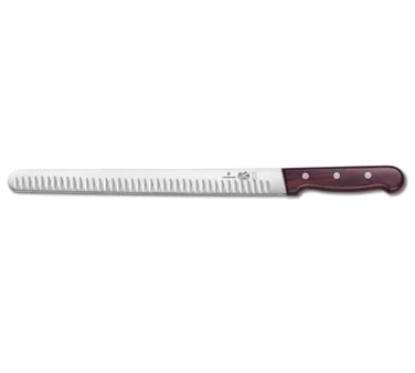 Culinary Mastery at Your Fingertips with the Victorinox Swiss Army, 5.4220.30, Knife, Slicer. This professional-grade slicer knife is a must-have tool for any commercial restaurant. With its 12" blade and granton edge, it effortlessly glides through meats, fruits, and vegetables, ensuring precise and even slices every time. The hollowed-out grooves on the side of the blade prevent food from sticking, making it ideal for slicing delicate ingredients like smoked salmon or prosciutto. The 1-1/4" wide rosewood handle provides a comfortable grip, allowing for extended use without fatigue. Elevate your culinary skills and achieve perfection in every slice with the Victorinox Swiss Army, 5.4220.30, Knife, Slicer.