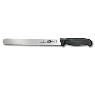 Enhance Your Restaurant's Culinary Efficiency with the Victorinox Swiss Army, 5.4233.25, Knife, Slicer. This high-quality slicer knife is designed to meet the demands of a busy commercial kitchen. With its 10" wavy edge blade and 1-1/4" width at the handle, it effortlessly slices through meats, vegetables, and more, ensuring precise and consistent cuts every time. The black Fibrox nylon handle is slip-resistant, providing a secure grip even in fast-paced environments. Made by Victorinox Swiss Army, a trusted name in cutlery, this knife is NSF certified, guaranteeing its safety and quality. Whether you're slicing deli meats for sandwiches or carving roasts for entrees, this slicer knife is a must-have tool for any professional chef or restaurant owner. Invest in the Victorinox Swiss Army, 5.4233.25, Knife, Slicer and elevate your restaurant's culinary capabilities.