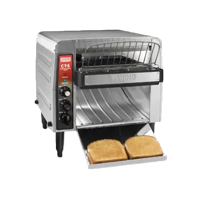Ignite culinary passion with the Waring CTS1000 Toaster, Conveyor Type. This commercial conveyor toasting system is a must-have for any restaurant looking to serve perfectly toasted bread, bagels, and more. With its horizontal conveyor and 2" opening, this toaster can handle up to 450 slices per hour, ensuring quick and efficient service during busy hours. The 5-minute heat-up time allows for minimal waiting, while the speed control and energy-saving standby functions help optimize energy usage. The brushed stainless steel construction not only adds a sleek and professional look to your kitchen but also ensures durability and easy cleaning. The cool-touch side panels provide added safety, preventing burns during operation. With its 120v/60/1-ph power supply, 15.0 amps, and 1800 watts, this toaster is ready to handle the demands of a commercial restaurant. Trust Waring, a reputable vendor in the industry, and elevate your toasting game with the CTS1000 Toaster, Conveyor Type.