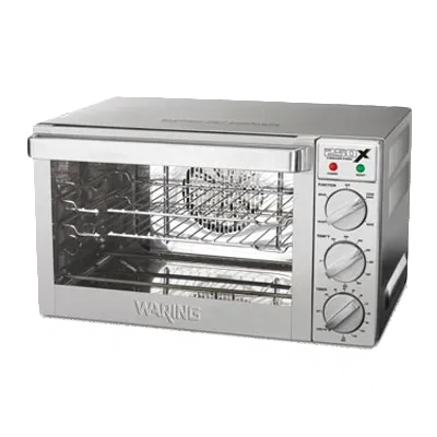Fuel your restaurant's success with the Waring WCO250X Convection Oven. This commercial countertop oven is designed to meet the demands of a busy restaurant kitchen. With its compact size of 21"W x 19"D x 12"H, it can easily fit on any countertop, saving valuable space. The electric oven features die-cast manual control knobs, allowing precise temperature adjustments within the 150-500F range. It can hold up to three quarter-size sheet pans, making it perfect for baking a variety of dishes. The double-pane glass oven door ensures excellent heat retention and allows you to monitor your food without opening the door. Made of stainless steel with a brushed finish, this oven is not only durable but also easy to clean. The Waring WCO250X Convection Oven is NSF, UL, and cULus certified, guaranteeing its quality and safety. Upgrade your restaurant kitchen with this reliable and efficient convection oven.