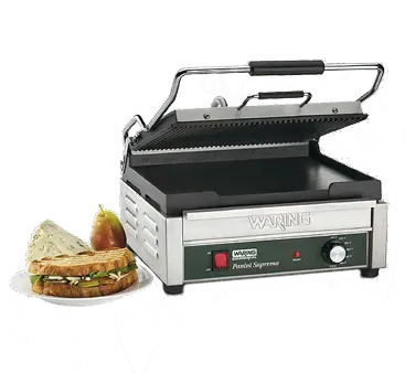 Introducing the Waring WDG250 Sandwich / Panini Grill, a must-have for any commercial restaurant looking to drive profitability. This dual surface panini grill is designed to deliver exceptional results with its 14-1/2" x 11" cooking surface. The hinged auto-balancing top plate, equipped with heat resistant handles, ensures even cooking and perfect grill marks every time. With a ribbed top and flat bottom grill, this versatile appliance allows you to create a variety of delicious sandwiches and paninis. The adjustable thermostats, reaching up to 570F (300C), give you precise control over the cooking temperature, while the indicator lights make monitoring a breeze. Made with a brushed stainless steel body and a removable drip tray, this grill is not only durable but also easy to clean. Trust Waring, a reputable vendor in the industry, and elevate your restaurant's sandwich game with the Waring WDG250 Sandwich / Panini Grill.