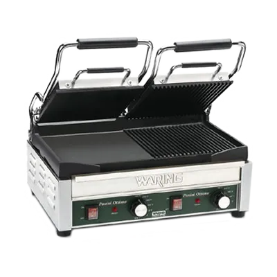 Unleash gastronomic brilliance with the Waring WDG300 Sandwich/Panini Grill. This dual surface grill is a must-have for any commercial restaurant. With a spacious 17" x 9-1/4" cooking surface, you can easily prepare multiple sandwiches or paninis at once, increasing efficiency and productivity in the kitchen. The hinged auto-balancing top plate with heat resistant handles ensures even cooking and allows for easy flipping of sandwiches. The half ribbed and half flat grill gives you the versatility to create a variety of delicious grilled creations. The adjustable thermostats, reaching up to 570F (300C), provide precise temperature control for perfect results every time. The indicator lights let you know when the grill is ready to use, and the brushed stainless steel body and removable drip tray make cleaning a breeze. Trust the Waring WDG300 to elevate your sandwich and panini game to new heights.