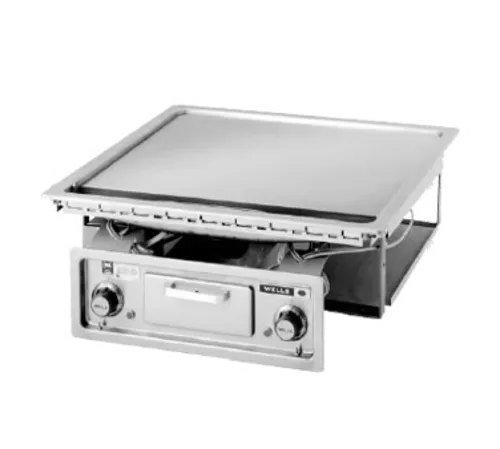 Wells G-136 Electric Built-In/Drop-In Griddle is ideal for any commercial kitchen based on their versatile, easy-to-use design. It features removable splash guards for easy clean, positive-off thermostats that allow for individual zone temperature control. Enclosed tubular elements are clamped onto the bottom of the griddle plate for even heat distribution over the entire surface. 4-Quart capacity, removable front grease drawer, protective guard rings to protect the controls, and features Wellsloks for quick and easy installation. 22"W x 18"D cooking surface, 208/240V