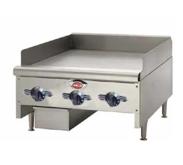 Serve with pride with the Wells HDTG-3630G Gas Countertop Griddle. This high-quality griddle is designed to meet the demands of a commercial restaurant kitchen. With a spacious 35-3/4" wide by 23-3/4" cooking surface, you'll have plenty of room to cook multiple items at once. The 3/4" griddle plate ensures even heat distribution for consistent cooking results. Equipped with three thermostat controls, you have precise control over the temperature of different cooking zones. The stainless steel construction not only provides durability but also makes cleaning a breeze. The splashguard helps to contain any splatters, keeping your kitchen clean and safe. With 4" steel legs, this griddle is stable and sturdy. With a powerful 90000 BTU, this griddle can handle high-volume cooking. NSF and cCSAus certified, you can trust the quality and safety of this Wells griddle. Upgrade your restaurant kitchen with the Wells HDTG-3630G Gas Countertop Griddle and experience superior cooking performance.