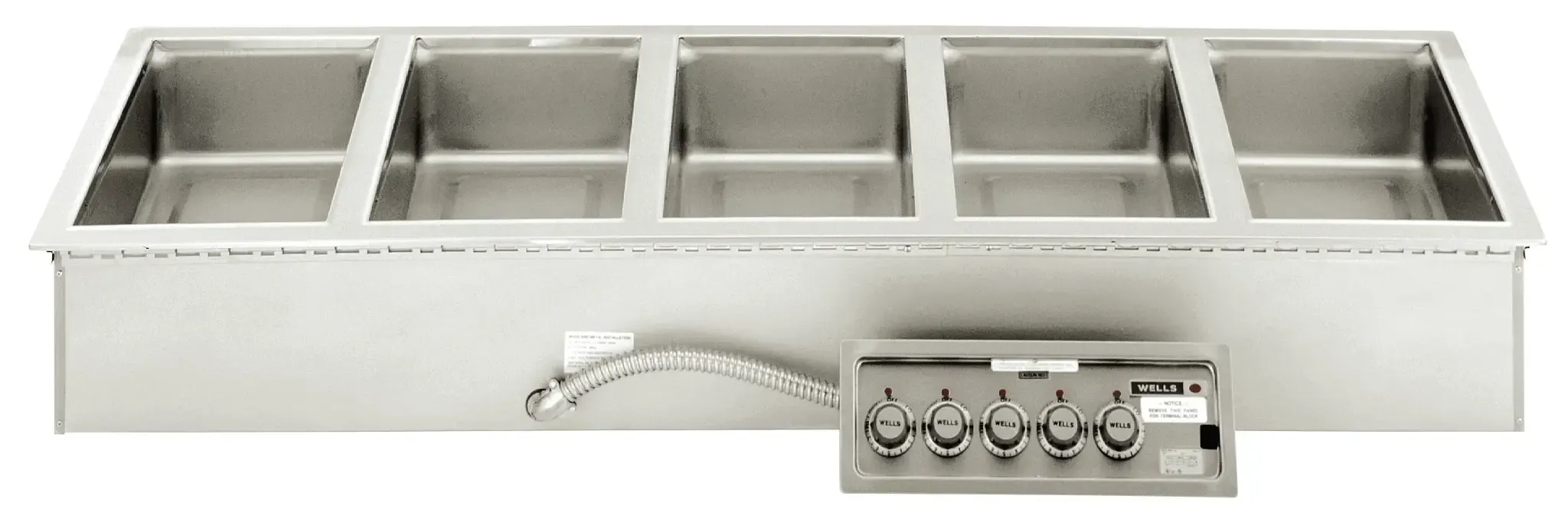 Wells MOD-500D heavy-duty, top-mount, drop-in, Modular food warmer is designed to hold heated foods at safe and fresh serving temperatures. Unit Accommodates 12" x 20" standard food pans or equivalent fractional inset pans and are designed for wet or dry operation. One-piece stainless steel top flange and heavy-gauge, deep-drawn stainless steel warming pans are standard features on all models. WellsLoks are standard for quick and easy installation. Sides, front, back, and bottom are fully insulated, Individual controls for each well, High-limits prevent overheating, and powerful tubular heating elements are located under the warming pans for quick, efficient, and even heating. Five pans, infinite control, Drain, 208/240V