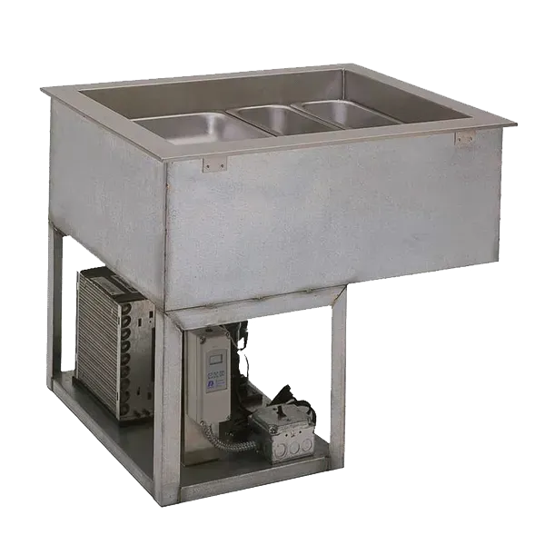Wells RCP-7300 Refrigerated Drop-In Cold Pans hold pre-chilled food products at cold, fresh, and safe serving temperatures and pans are recessed 3" to comply with NSF-7 Performance requirements. Unit is completely self-contained with individual thermostatic controls, use R-513A CFC free refrigerant system featuring sight glass, and include an 8 ft. cord and plug. One-piece top flange and coved-corner interiors constructed of stainless steel. Exterior body constructed of heavy gauge, corrosion resistant steel. Condensing unit mounted on corrosion resistant frame below the cold pan. Featuring wrapped coil construction on both sides and bottom, on/off switch, easy service valves, dryer/filter and receiver. Condensing unit may be easily removed for service. 1" drain, Three 12" x 20" pans.